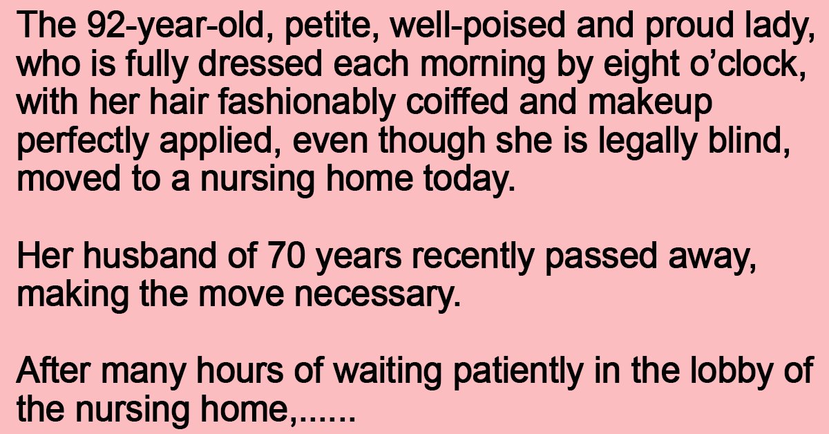 The 92-year-old, petite, well-poised and proud lady, who is fully dressed each morning by eight o’clock, with her hair fashionably coiffed and makeup perfectly applied, even though she is legally blind, moved to a nursing home today.
