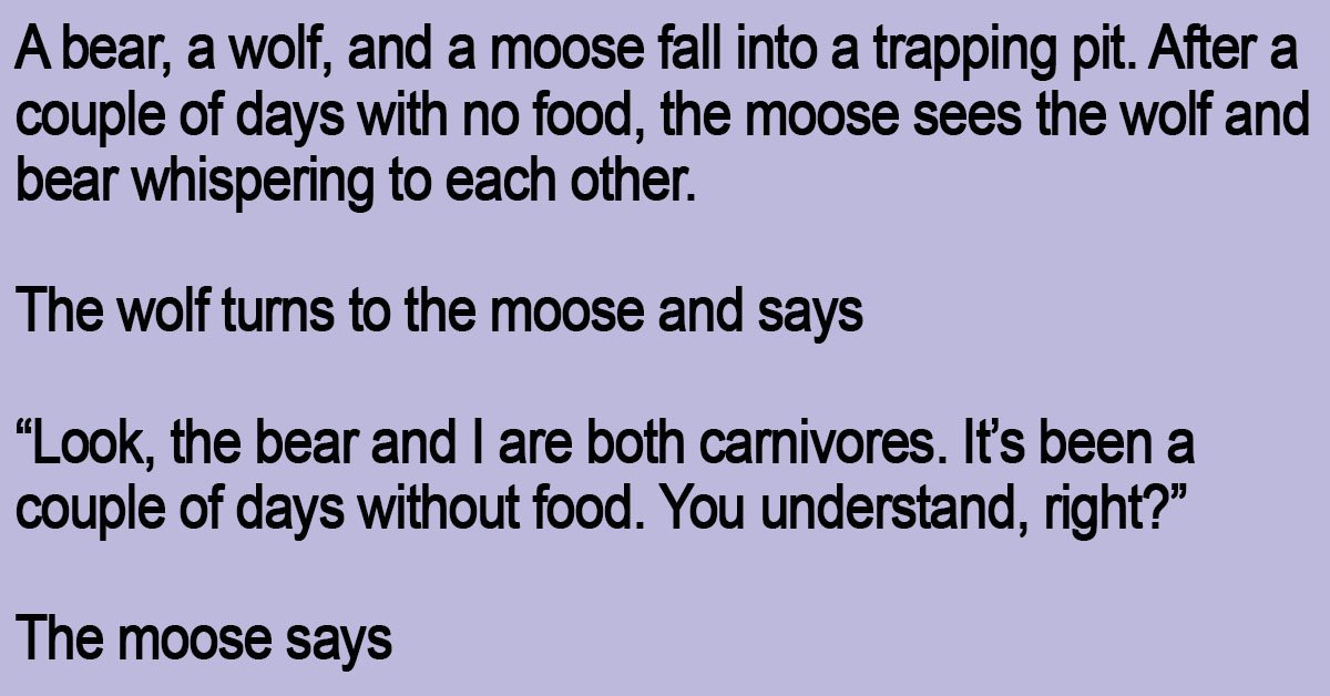After a couple of days with no food, the moose sees the wolf and bear whispering to each other.