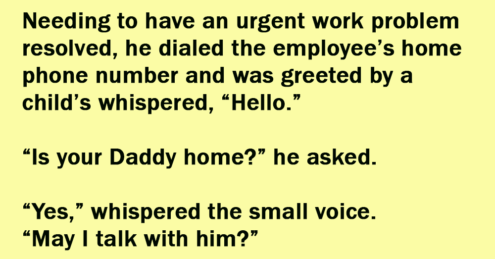 Needing to have an urgent work problem resolved, he dialed the employee’s home phone number and was greeted by a child’s whispered, “Hello.”