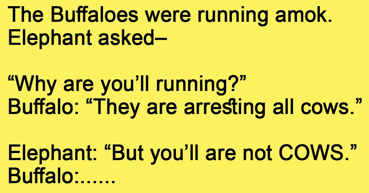 The Buffaloes Were Running Amok. November 14, 2023 by Kevin Adams Facebook Twitter Pinterest LinkedInThe Buffaloes were running amok. Elephant asked– “Why are you’ll running?” Buffalo: “They are arresting all cows.” Elephant: “But you’ll are not COWS.” Buffalo: “It will take atleast few years to prove that in a court!” The Elephant started running! Facebook Twitter Pinterest LinkedIn