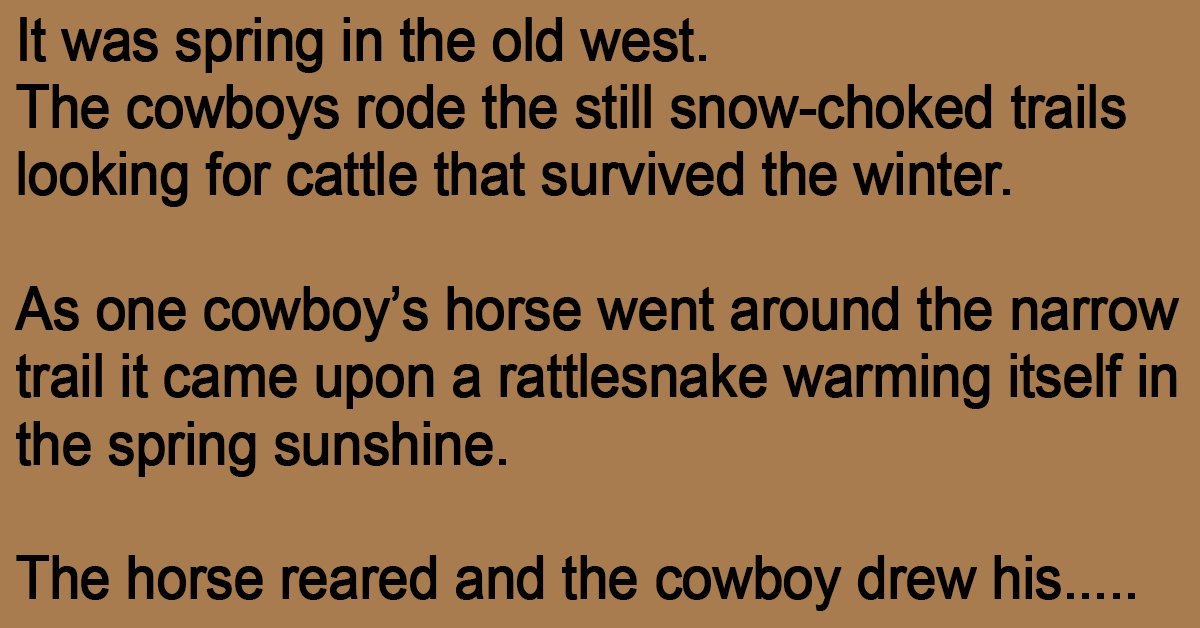 As one cowboy’s horse went around the narrow trail it came upon a rattlesnake warming itself in the spring sunshine.