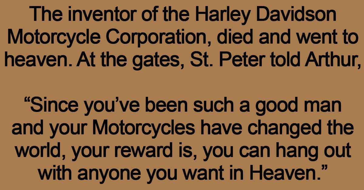 The inventor of the Harley Davidson Motorcycle Corporation, died and went to heaven.