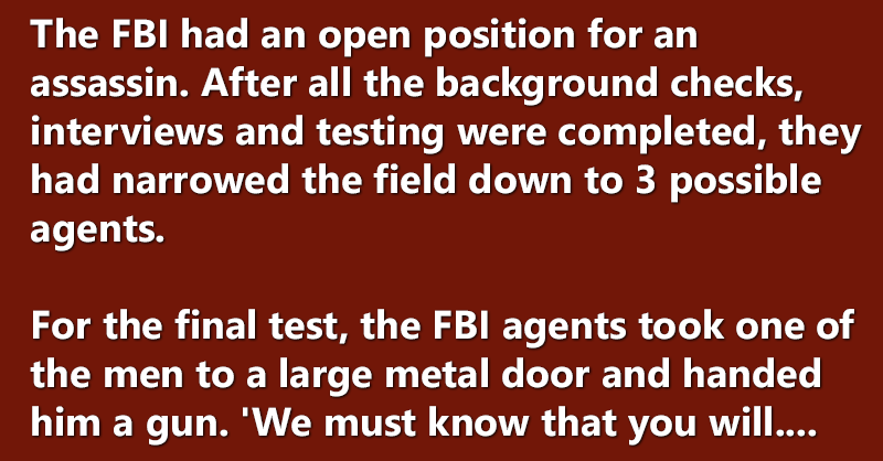 The FBI had an open position for an assassin. After all the background checks, interviews and testing were completed, they had narrowed the field down to 3 possible agents.