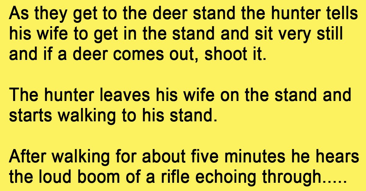 As they get to the deer stand the hunter tells his wife to get in the stand and sit very still and if a deer comes out, shoot it.