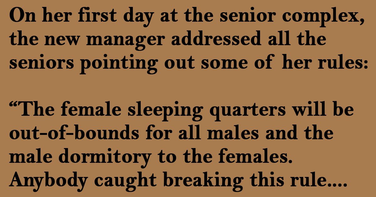 On her first day at the senior complex, the new manager addressed all the seniors pointing out some of her rules: