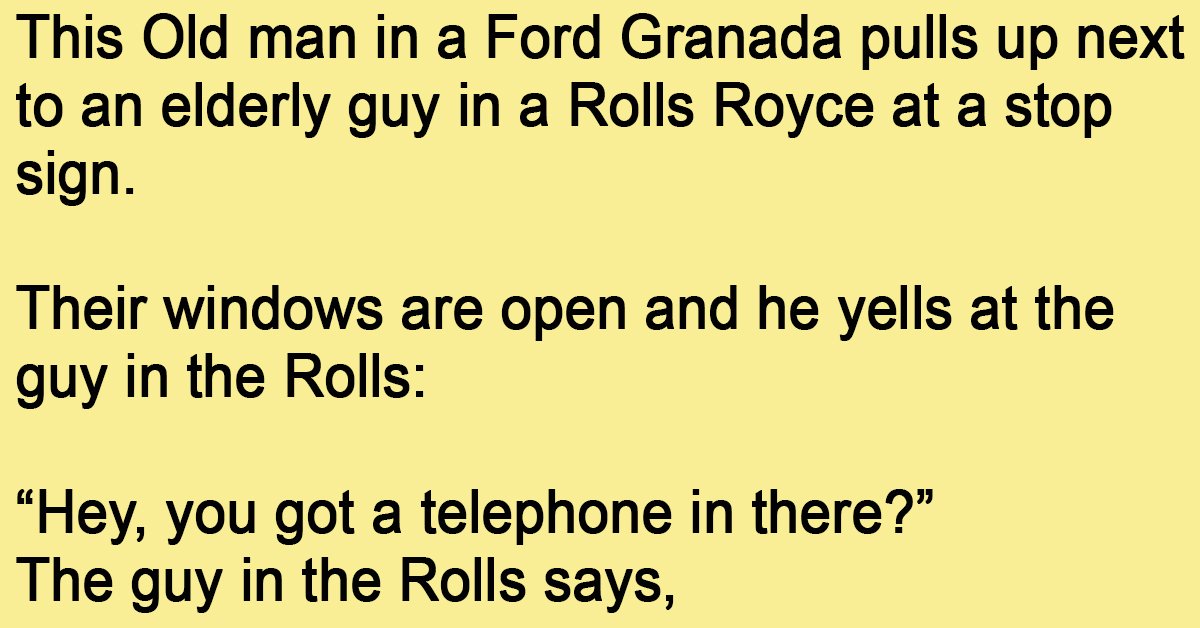 This Old man in a Ford Granada pulls up next to an elderly guy in a Rolls Royce at a stop sign.
