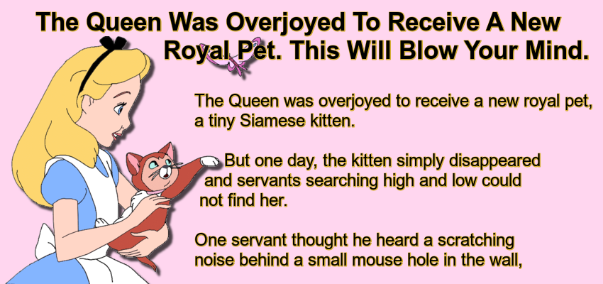 The Queen Was Overjoyed To Receive A New Royal Pet. – April 2, 2022 by Kevin Adams Facebook Twitter Pinterest LinkedIn The Queen was overjoyed to receive a new royal pet, a tiny Siamese kitten. But one day, the kitten simply disappeared and servants searching high and low could not find her. One servant thought he heard a scratching noise behind a small mouse hole in the wall, So the King ordered the hole to be widened to rescue the poor kitty. Unfortunately, the wall was weakened, causing it to collapse. Luckily, the commotion woke the kitten up and it came out from behind a bookcase, safe and sound. The next day, in the Royal Newspaper, was the headline: “KING UNABLE TO LOCATE QUEEN’S P*$$Y; DESTROYS the WRONG H0LE” Facebook Twitter Pinterest LinkedIn