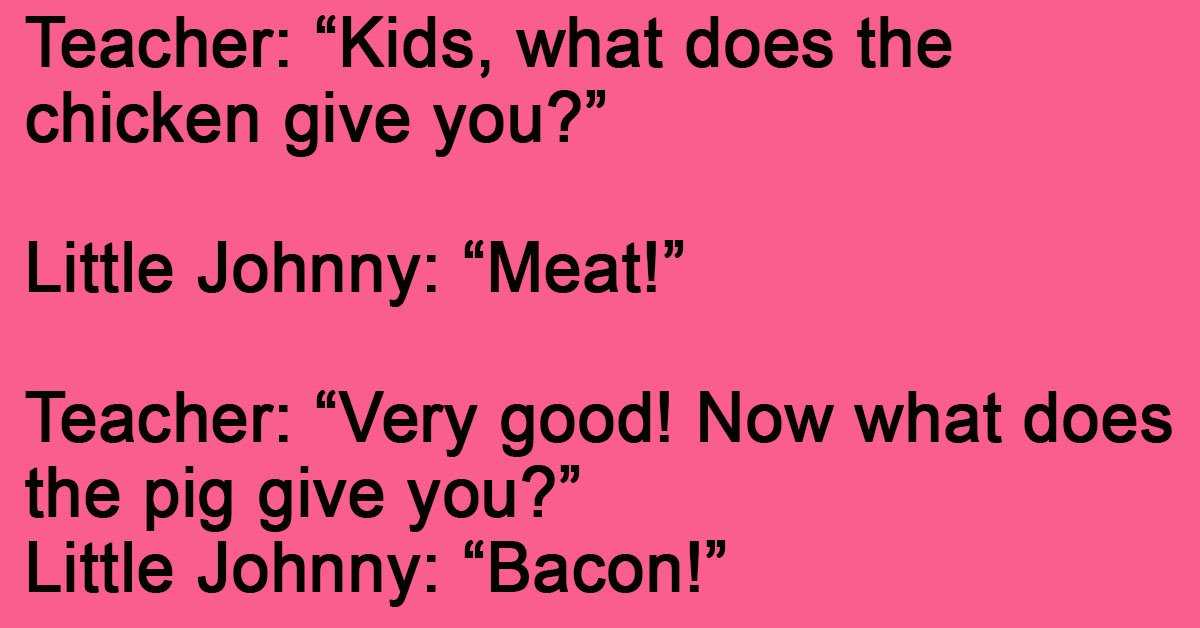 The Teacher Quizzes The Students. August 6, 2023 by Kevin Adams Facebook Twitter Pinterest LinkedInTeacher: “Kids, what does the chicken give you?” Little Johnny: “Meat!” Teacher: “Very good! Now what does the pig give you?” Little Johnny: “Bacon!” Teacher: “Great! And what does the fat cow give you?” Little Johnny: “Homework!” Facebook Twitter Pinterest LinkedIn