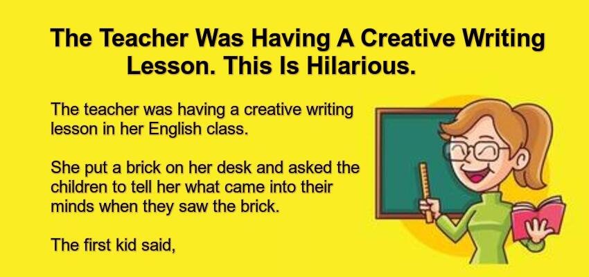 The Teacher Was Having A Creative Writing Lesson. – June 7, 2022 by Kevin Adams Facebook Twitter Pinterest LinkedIn The teacher was having a creative writing lesson in her English class. She put a brick on her desk and asked the children to tell her what came into their minds when they saw the brick. The first kid said, “I think about my dad. He is a construction worker”. Another said, “I think about our new house”. Then the teacher thought, “Why don’t I ask Johnny? After all, what can he say about a brick that would be improper?” So she asked, “Johnny, what do you think about when you see this brick”? Johnny said, “Naked chicks”! The teacher was horrified, “But why Johnny? Why? This is a brick”! Johnny said, “But that’s what I always think about”! Facebook Twitter Pinterest LinkedIn