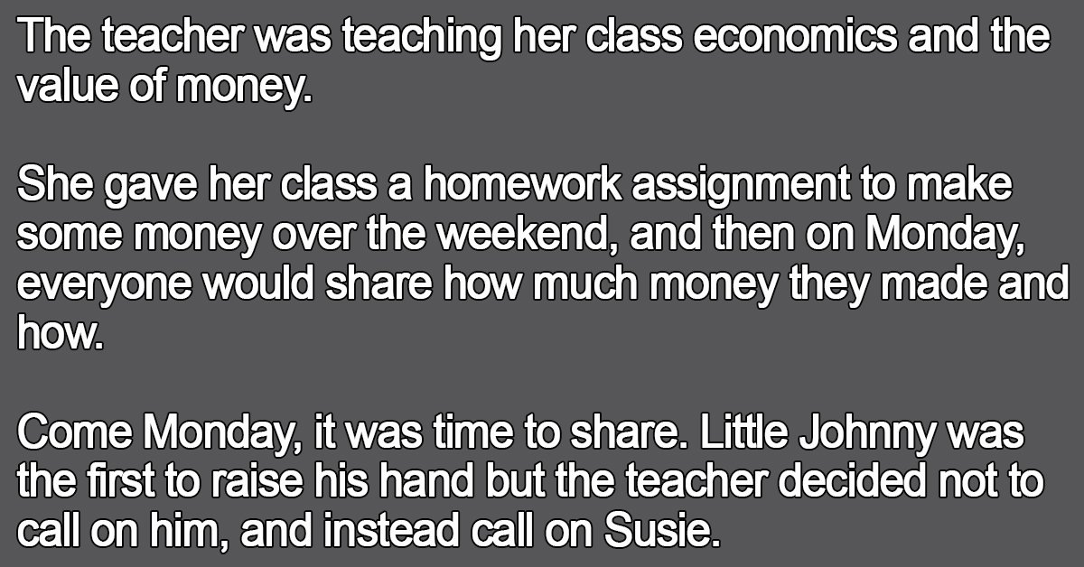 She gave her class a homework assignment to make some money over the weekend, and then on Monday, everyone would share how much money they made and how.