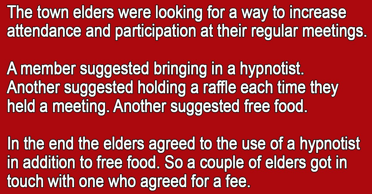 The town elders were looking for a way to increase attendance and participation at their regular meetings.