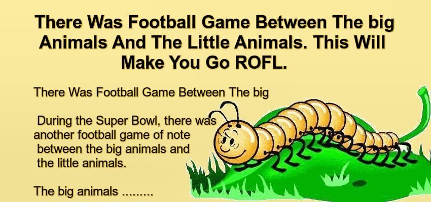 There Was Football Game Between The big Animals And The Little Animals. – April 20, 2022 by Kevin Adams Facebook Twitter Pinterest LinkedIn During the Super Bowl, there was another football game of note between the big animals and the little animals. The big animals were crushing little animals and at half-time, the coach made a passionate speech to rally the little animals. At the start of the second half, the big animals had the ball. In the first play, the elephant got stopped for no gain. In the second play, the rhino was stopped for no gain. On third down, the hippo was thrown for a 5-yard loss. The defence huddled around the coach and he asked excitedly, “Who stopped the elephant?” “I did,” said the centipede. “Who stopped the rhino?” “Uh, that was me too,” said the centipede. “And how about the hippo? Who hit him for a 5-yard loss?” “Well, that was me as well,” said the centipede. “So where were you during the first half?” demanded the coach. “Well,” said the centipede, “I was having my ankles taped.” Facebook Twitter Pinterest LinkedIn