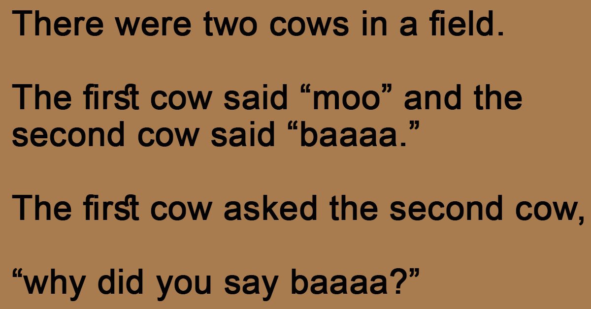 There Were Two Cows In A Field. July 17, 2023July 15, 2023 by Kevin Adams Facebook Twitter Pinterest LinkedInThere were two cows in a field. The first cow said “moo” and the second cow said “baaaa.” The first cow asked the second cow, “why did you say baaaa?” The second cow said, “I’m learning a foreign language.” Facebook Twitter Pinterest LinkedIn