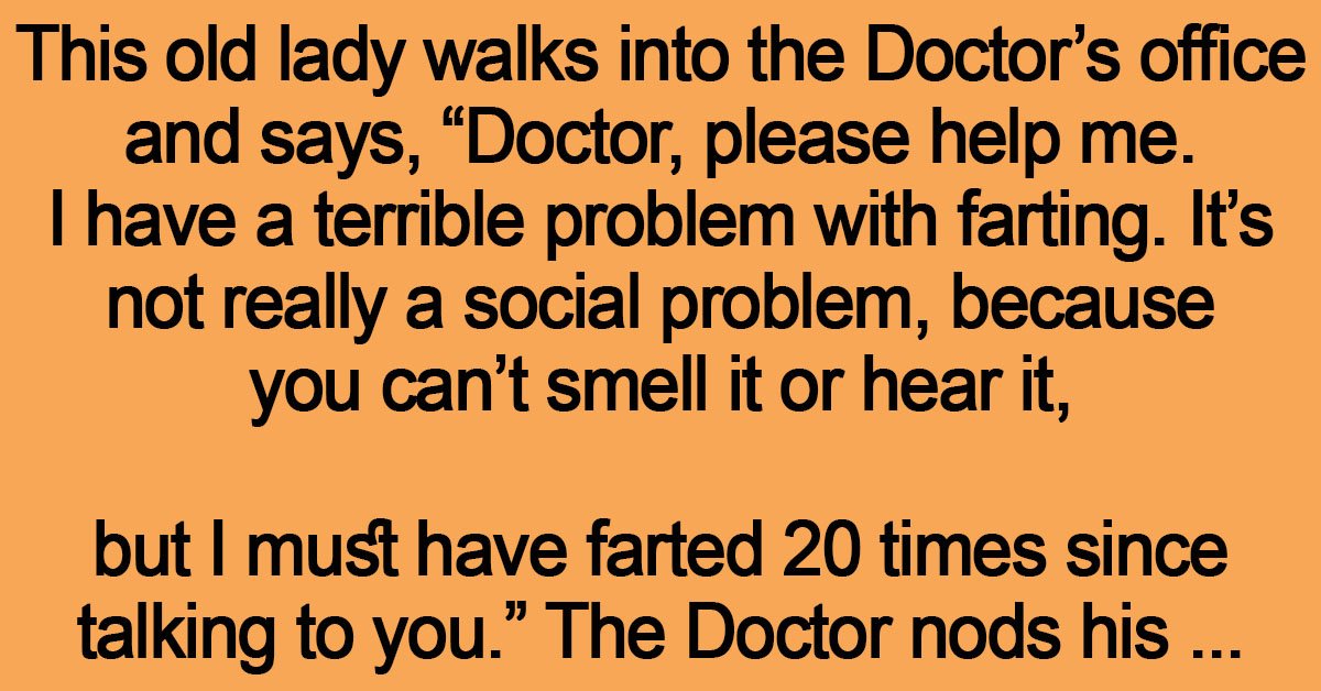“Doctor, please help me. I have a terrible problem with farting. It’s not really a social problem, because you can’t smell it or hear it, but I must have farted 20 times since talking to you.”