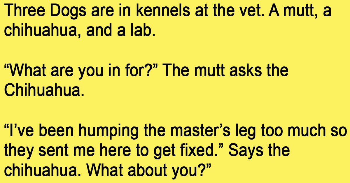 “I knocked up the poodle next door. She’s purebred with papers so the neighbors are suing my family. I’m here to get fixed as well.” Replies the mutt.