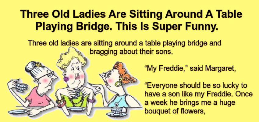 Three old ladies are sitting around a table playing bridge and bragging about their sons.