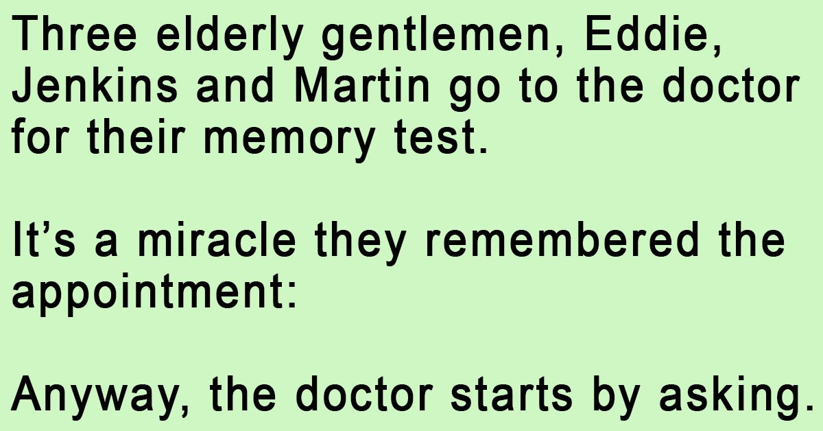 Three elderly gentlemen, Eddie, Jenkins and Martin go to the doctor for their memory test.