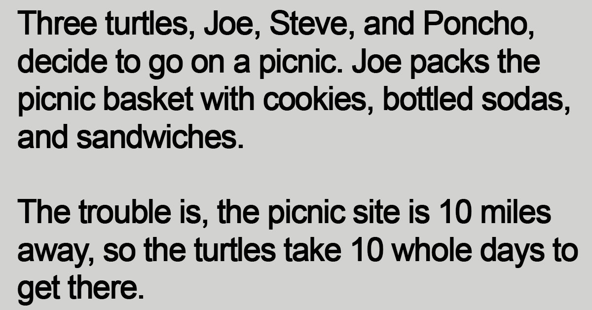The trouble is, the picnic site is 10 miles away, so the turtles take 10 whole days to get there.