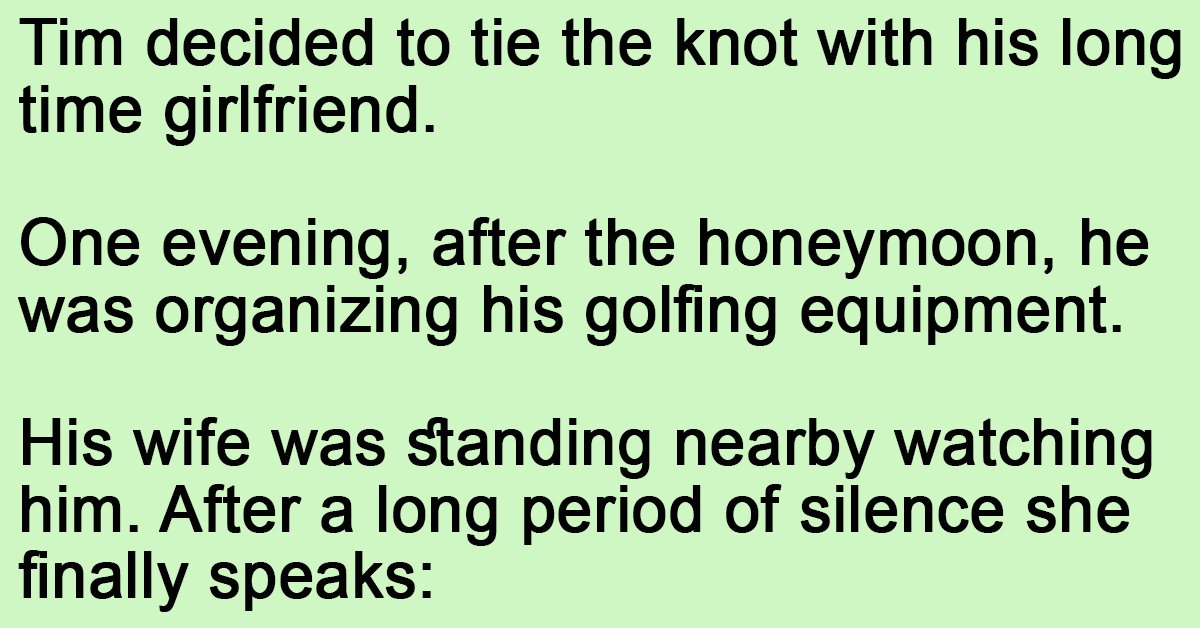 “Tim, I’ve been thinking, now that we’re married maybe it’s time you quit golfing. You spend so much time on the course. You could probably get a good price for your clubs.”