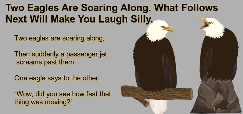 Two Eagles Are Soaring Along. – June 1, 2022 by Kevin Adams Facebook Twitter Pinterest LinkedIn Two eagles are soaring along, Then suddenly a passenger jet screams past them. One eagle says to the other, “Wow, did you see how fast that thing was moving?” The other replies, “Yeah.” “You’d move fast too if you had four b*tt holes and they were all on fire!” Facebook Twitter Pinterest LinkedIn