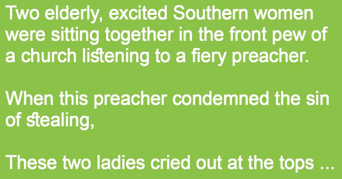Two elderly, excited Southern women were sitting together in the front pew of a church listening to a fiery preacher.