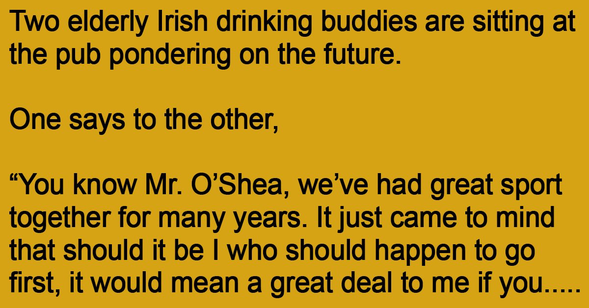 “You know Mr. O’Shea, we’ve had great sport together for many years. It just came to mind that should it be I who should happen to go first, it would mean a great deal to me if you would say a few kind words at me grave.”