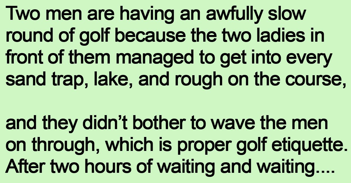 Two men are having an awfully slow round of golf because the two ladies in front of them managed to get into every sand trap, lake, and rough on the course,