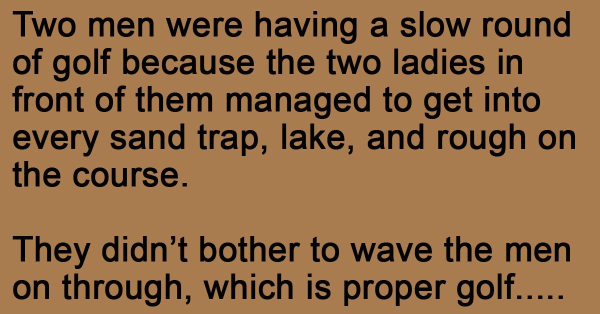 Two men were having a slow round of golf because the two ladies in front of them managed to get into every sand trap, lake, and rough on the course.