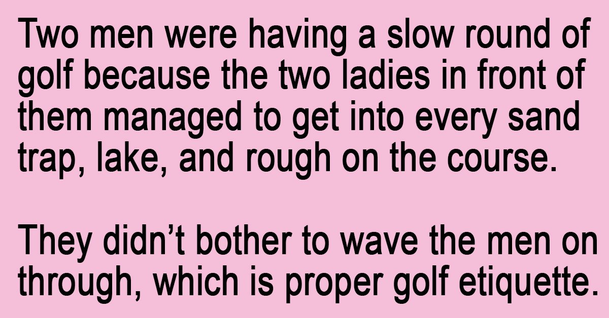 Two men were having a slow round of golf because the two ladies in front of them managed to get into every sand trap, lake, and rough on the course.