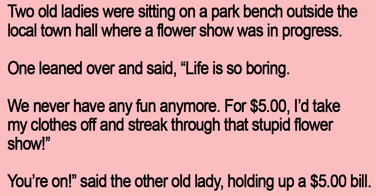 As fast as she could, the first little old lady fumbled her way out of her clothes and, completely naked, streaked through the front door of the flower show.