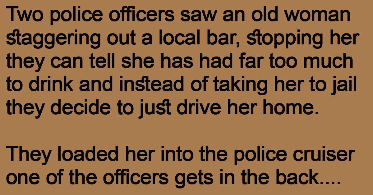 Two police officers saw an old woman staggering out a local bar, stopping her they can tell she has had far too much to drink and instead of taking her to jail they decide to just drive her home.