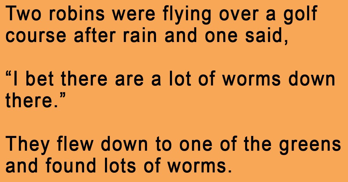 Two robins were flying over a golf course after rain and one said,