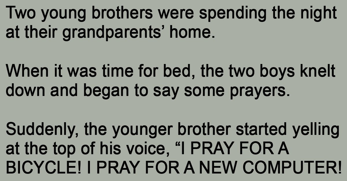 “I PRAY FOR A BICYCLE! I PRAY FOR A NEW COMPUTER! I PRAY FOR A TRIP TO DISNEYLAND!” and so on…